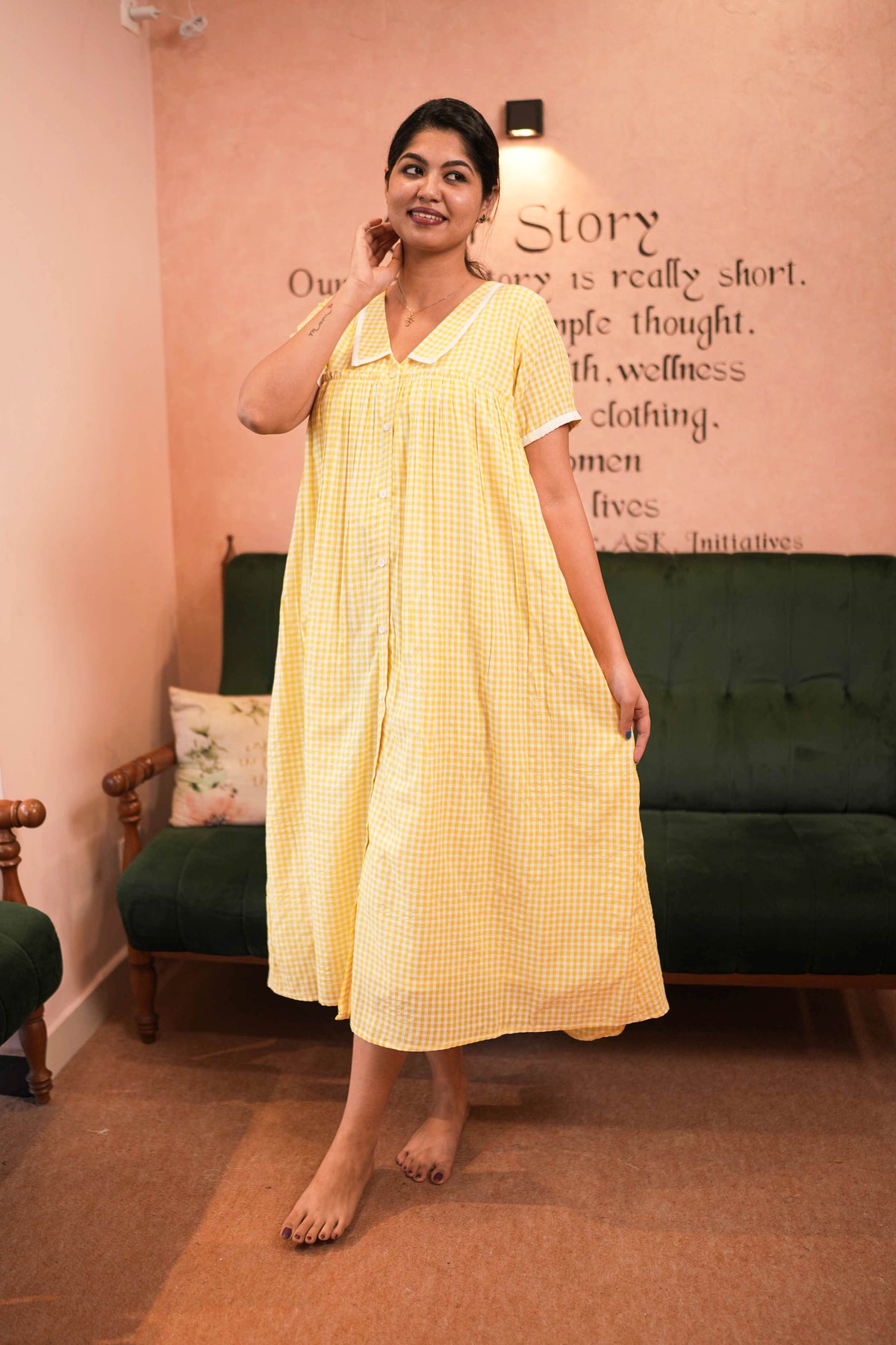 This elegant button-down hospital dress features a soft cambric cotton lining, designed specifically for maternity and feeding comfort. Its thoughtful fit adapts to your changing body, providing ease and practicality without compromising style during your special moments. Perfect for new mothers seeking both functionality and refined comfort.